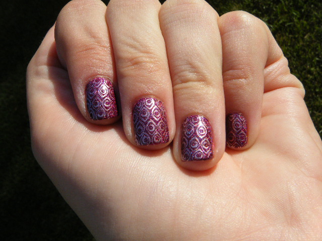 I started with OPI DS Extravagance and then stamped with my Bundle Monster plate #212 using Sally Hansen Pink Satin.